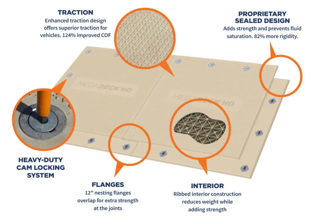 MegaDeck™ er et tungt kjøreplatesystem som innehar de største panelene og de aller beste bæreegenskapene på markedet. MegaDeck er den ideelle løsningen for å etablere en midlertidig vei over et våtmarksomåde. Foruten å kunne konstruere en midlertidig adkomstvei over sårbart terreng, så bruk dem gjerne til å konstruere en midlertidig parkeringsplass, eller for å etablere en midlertidig lagringsplass for tungt utstyr.